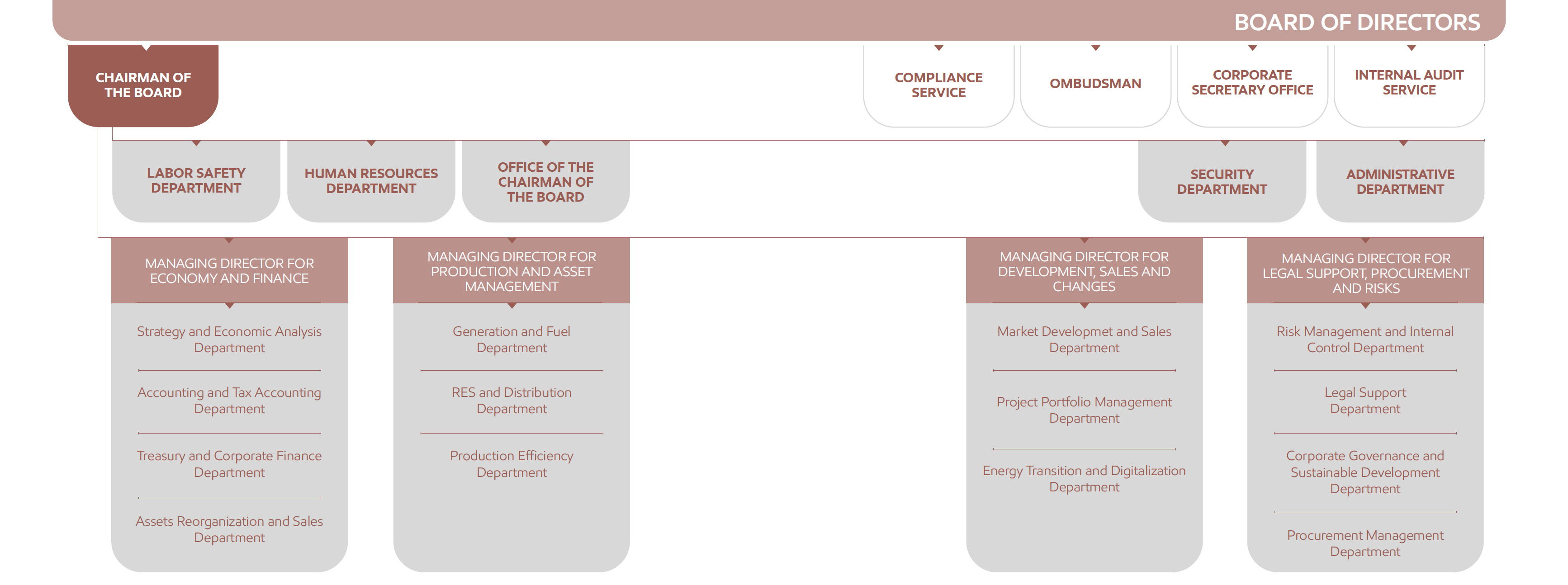 The corporate governance system of Samruk-Energy JSC ensures a clear separation of powers and responsibilities between management bodies, officials and personnel, compliance with the hierarchy of the procedure for considering issues and making decisions, as well as compliance with the legislation and internal documents.