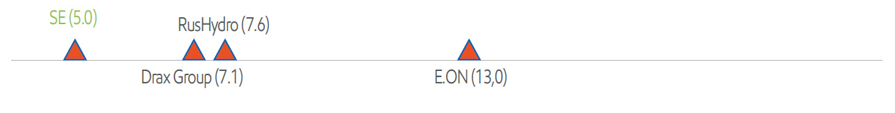 According to benchmarking results (data from the following peer companies were used: Mosenergo, Russia; CEZ Group, Czech Republic; Drax Group, Great Britain) Samruk-Energy is inferior to foreign peers in some respects. Financial sustainability indicators show that the Company is making full use of available financial leverage. Samruk-Energy outperforms its peers in terms of EBITDA margin and Debt/EBITDA. This indicates a high return on sales. However, ROIC (return on long-term invested capital) is below its European peers.