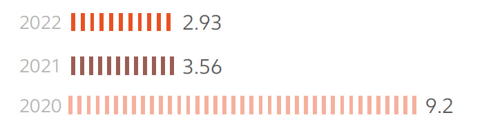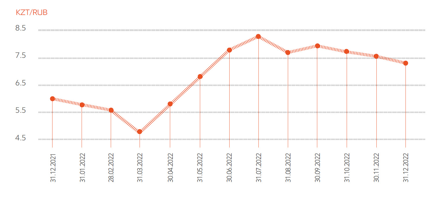 At the end of 2022, the exchange rate fluctuated from 431.67 KZT/USD to 462.65 KZT/USD (a weakening of ~7%), with a fluctuation of 512 KZT/USD during the year.