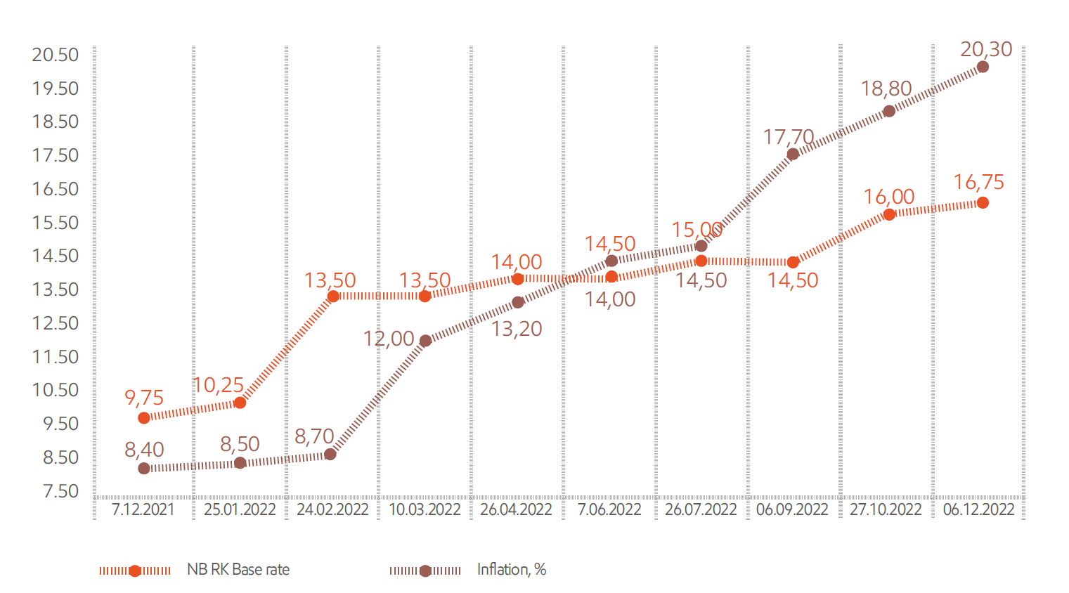 The negative external background in 2022 has also had an impact on the depreciation of the national currency by 8.1% against the US dollar. The tenge also depreciated against the Russian rouble by 20%. Given the prevailing volume of imports from Russia, it led to a further increase in the inflationary pressure on the economy. In view of the high inflation rate and continuing pro-inflation risks, the National Bank of Kazakhstan raised the base rate first to 16.0% and then to 16.75%. It also expressed the need to maintain the base rate at the current level for an extended period.