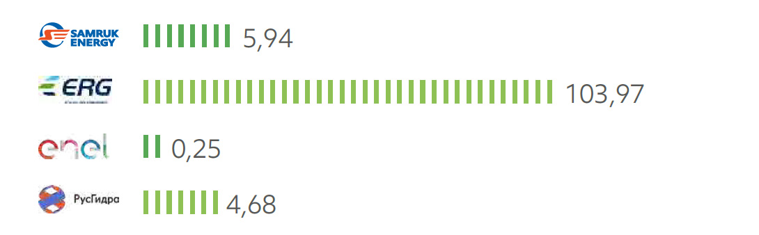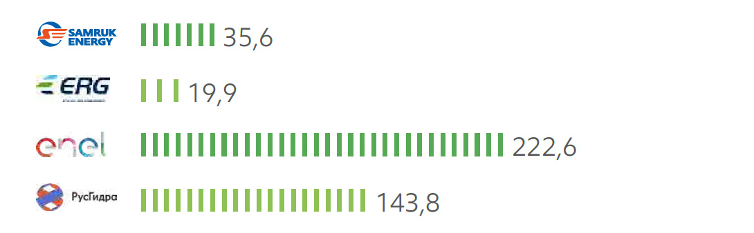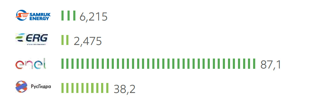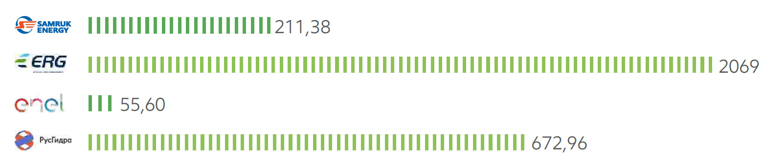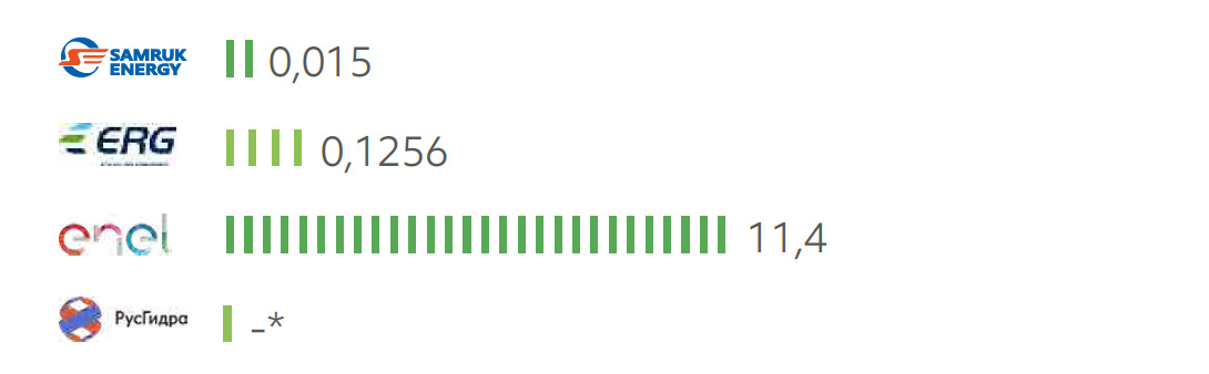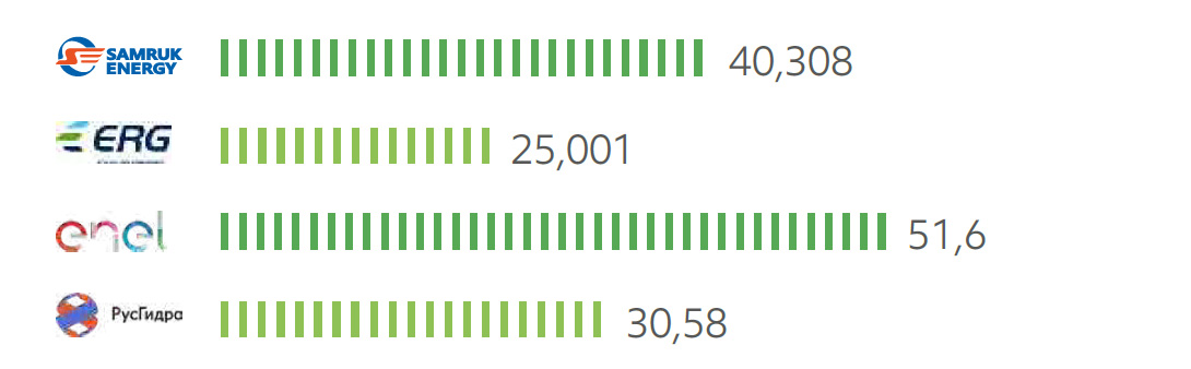 - по объёмам водозабора пресной воды: на 21% больше, чем РусГидро, значительно ниже, чем у ERG и выше, чем у компании Enel.