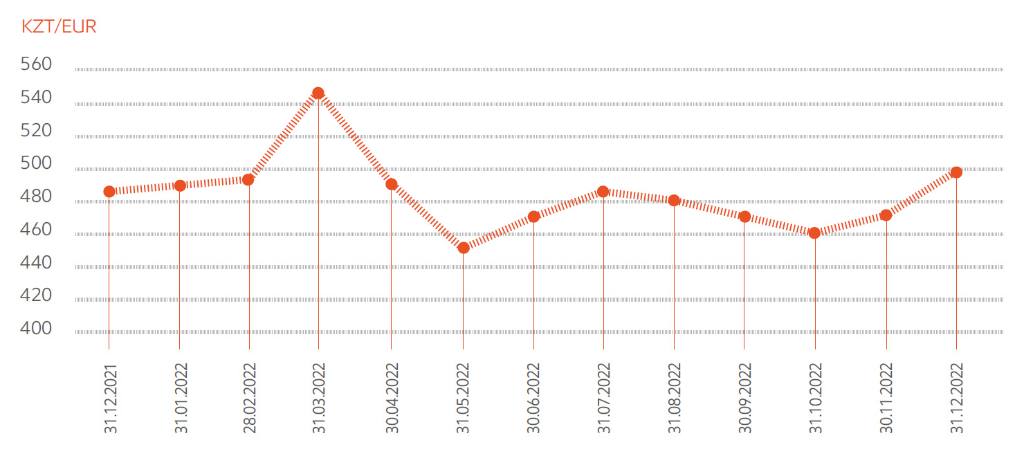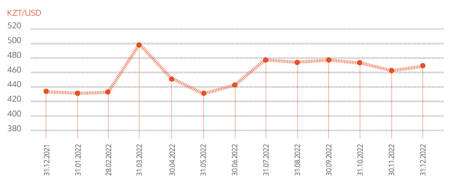 По итогам 2022 г. биржевой курс тенге изменялся с 431,67 тенге/доллар США с начала года до 462,65 тенге/доллар США (ослабление на ~ 7%), при этом колебания курса в течении года были зафиксированы на уровне 512 тенге/доллар США.