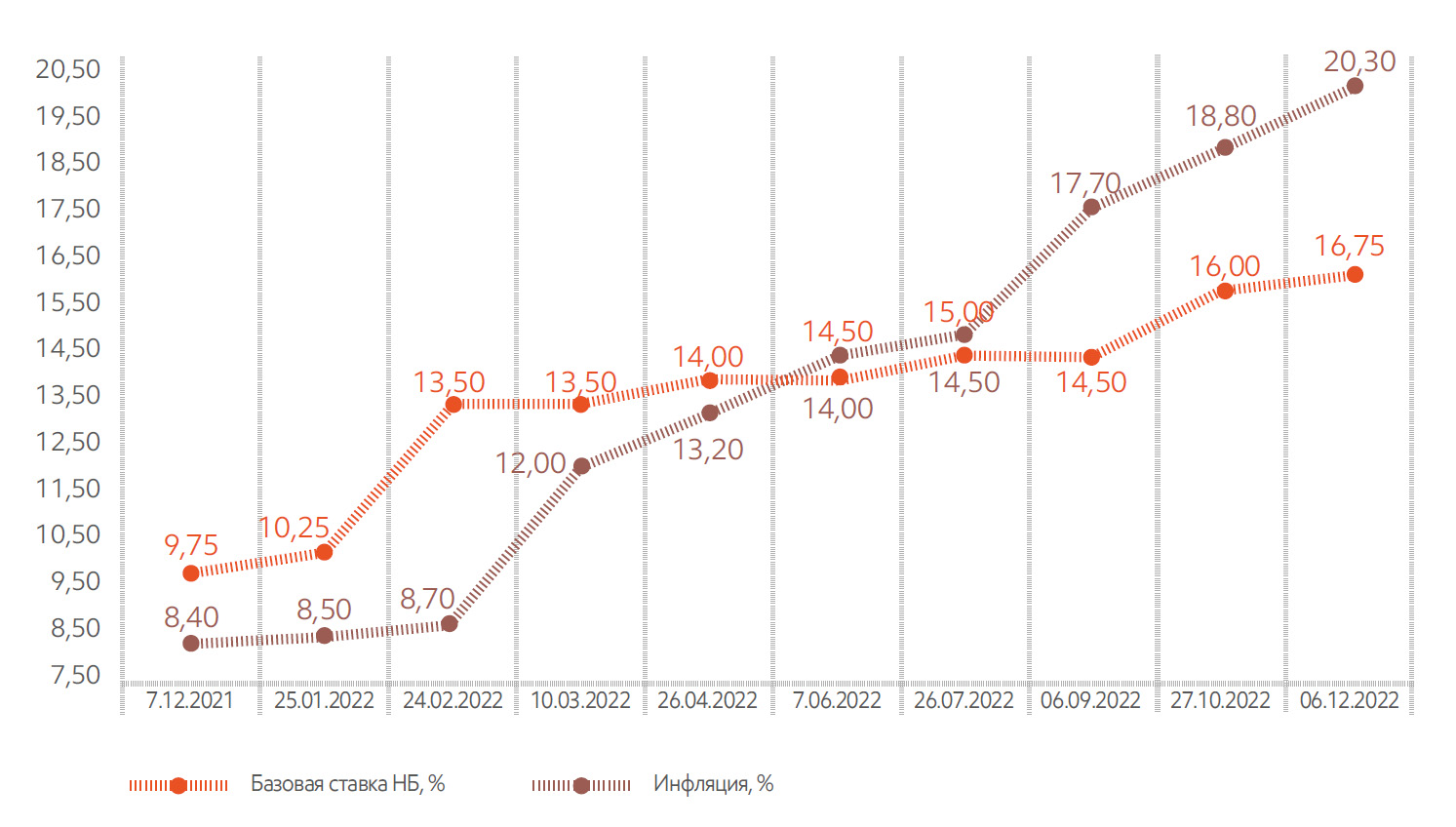 Внешний негативный фон в 2022 г. сказался и на ослаблении национальной валюты, курс которой обесценился к доллару США на 8,1%. В то же время курс тенге ослаб и к российскому рублю на 20%, что с учетом преобладающего объема импорта из России дополнительно усилило инфляционное давление на экономику. На фоне высоких темпов инфляции и с учетом сохранения про-инфляционных рисков НБ РК повысил базовую ставку сначала до 16,0%, а потом до 16,75%, высказав необходимость поддержания базовой ставки на сложившемся уровне в продолжительном периоде.